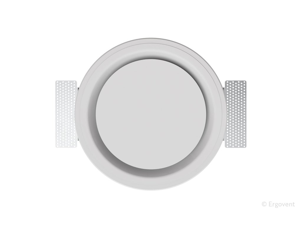 Sádrový talířový ventil ERGOVENT RONDO COANDA 125 představuje elegantní a funkční řešení pro přívod i odvod vzduchu v moderních interiérech. Díky bezrámečkovému minimalistickému designu dokonale zapadne do sádrokartonových podhledů nebo stěn a po přetření splyne s okolním povrchem. Speciální tvar s využitím Coanda efektu zajišťuje plynulé vedení vzduchu podél stropu, rovnoměrné rozložení v místnosti a vysoký uživatelský komfort bez průvanu.