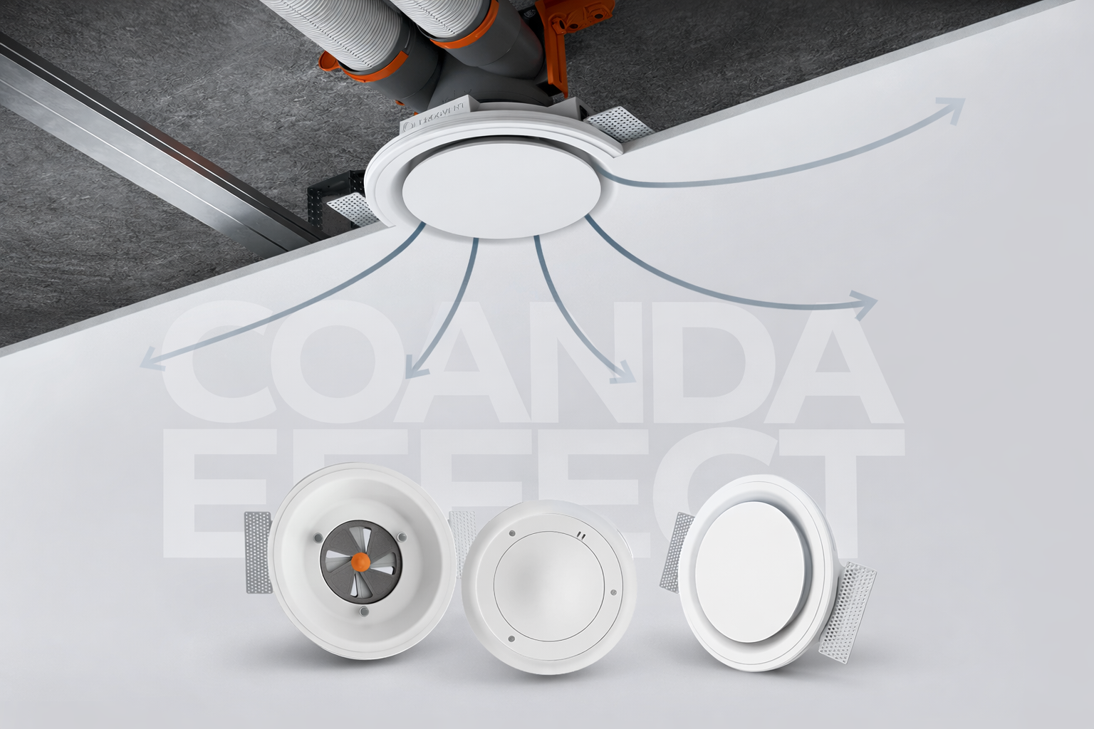 Coandův efekt je fyzikální jev, kdy proud vzduchu přirozeně „přilne“ k blízkému povrchu a drží se ho. V praxi to znamená, že přiváděný vzduch není vedený přímo dolů do prostoru, ale vede se podél stropu (nebo stěny) a postupně se rovnoměrně promíchá s okolním vzduchem.